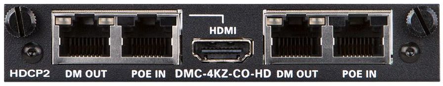 The DMC-4KZ-CO-HD is an output card designed for use with any card-based Crestron® DigitalMedia™ Switcher. It provides two independent DM 8G+® outputs, plus one HDMI® output. The HDMI output carries the same signal as the first DM 8G+ output. Both DM 8G+ outputs are compatible with HDBaseT®. Using a single CAT type twisted pair cable, each DM 8G+ output enables connection to a DM 8G+ receiver, the input of another DM® switcher, or an HDBaseT certified display device or receiver.