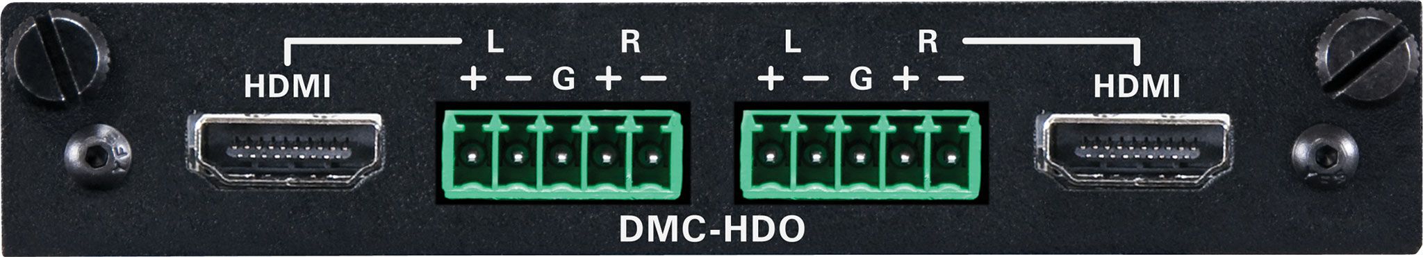 A modular output card for DM-MD8X8, DM-MD16X16, or DM-MD32X32 switchers. Provides two independent HDMI® outputs, each with a complementary balanced analog audio output.