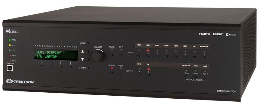 The DMPS3-4K-250-C from Crestron® offers an all-in-one 4K AV presentation system for classrooms, boardrooms, lecture halls, and video conference rooms. Delivering a complete, custom-programmable room solution with fully-configurable signal routing and processing is easy and cost-effective using the DMPS3-4K-250-C. In one 3-space rack mount package, it integrates the control system, matrix switcher, video scaler, streaming decoder, mic mixer, audio DSP, and amplifier. Its built-in AirMedia® gateway, when activated, enables wireless presentation from computers and mobile devices. DigitalMedia 8G+® and HDBaseT® connectivity affords a streamlined, long-distance wiring solution for remote sources and display devices, and for facility-wide integration as part of a larger media distribution system.Note: To purchase the DMPS3-4K-250-C with AirMedia pre-activated (no license required), see model DMPS3-4K-250-C-AIRMEDIA.