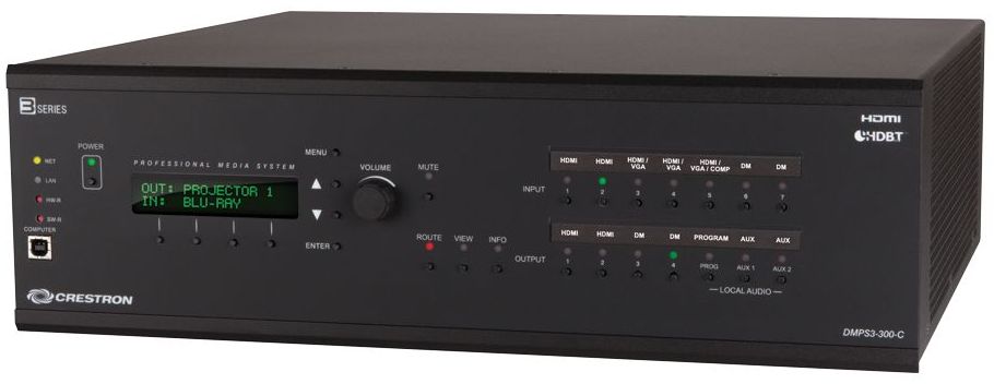 Provides a complete presentation control and signal routing solution for boardrooms and classrooms. Integrates the control system, multi-format matrix switcher, mic mixer, audio DSP, amplifier, and DigitalMedia distribution center all into a single 3-space rackmount package. Affords substantial signal routing flexibility and high-performance signal processing without the need for separate components. Built-in .AV Framework™ enables simplified configuration and control without programming.The DMPS3-300-C from Crestron® delivers a complete, high-definition presentation control and signal routing solution for classrooms, boardrooms, lecture halls, and videoconference rooms. It integrates the control system, multi-format matrix switcher, mic mixer, audio DSP, and amplifier all into one 3-space rack mount package. The DMPS3-300-C offers extensive signal routing flexibility and high-performance signal processing without the need for separate components. Auto-configuring inputs enable plug-and-play compatibility with a wide range of digital and analog sources. Built-in DigitalMedia 8G+® and HDBaseT® connectivity affords a streamlined, long-distance wiring solution for remote sources and display devices, and for facility-wide integration as part of a larger media distribution system.