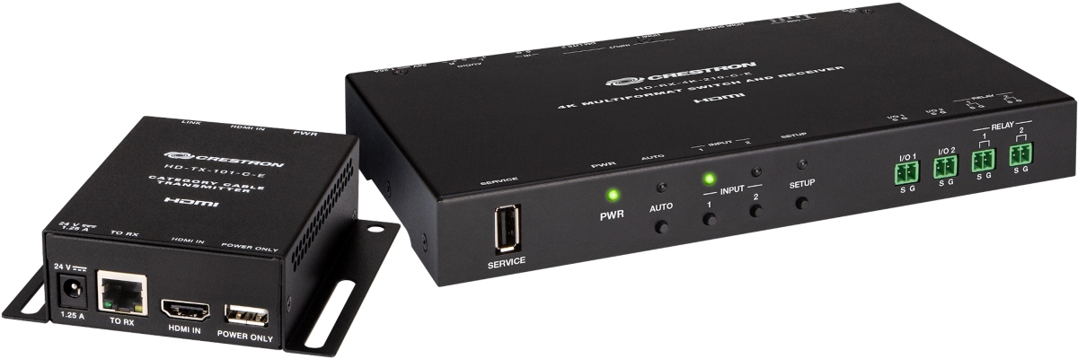 The Crestron® HD-MD-4K-200 provides a cost-effective multimedia presentation solution for classrooms and meeting spaces. Consisting of a transmitter (HD-TX-101-C-E) and receiver (HD-RX-4K-210-C-E), the HD-MD-4K-200 extends an HDMI® signal over a CATx (CAT5e or higher) twisted pair cable. For resolutions up to 2K, the maximum transmission distance is 230 ft (70 m). For higher resolutions up to 4K, the maximum transmission distance is 130 ft (40 m).
