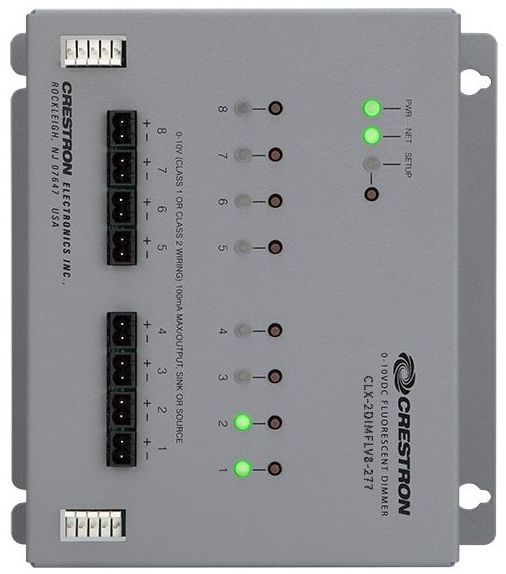 - The CLX-2DIMFLV8-277 interfaces with a Crestron control system (a.k.a., control processor or automation processor) via Cresnet. Cresnet is a simple 4-wire network bus that provides the communications backbone for a system of Crestron lighting dimmers, switches, keypads, shades, thermostats, and other devices.