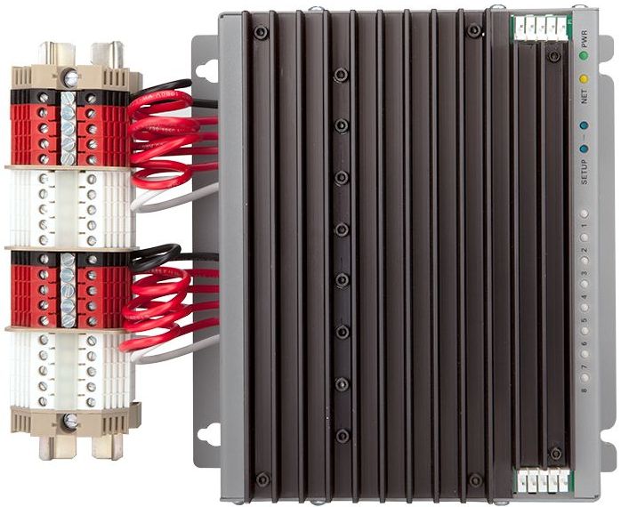 - Each lighting control module, including the GL-CAEN-2DIMU8-277, ships complete with a DIN rail terminal block for termination of the high-voltage feed and load wiring. This terminal block mounts beside the module within the enclosure. Low-voltage control signals are bussed between each of the modules within an enclosure via a simple 5-wire link (interconnect jumpers included), which terminates to a single terminal block (model CAEN-BLOCK, sold separately) at the bottom of the enclosure.