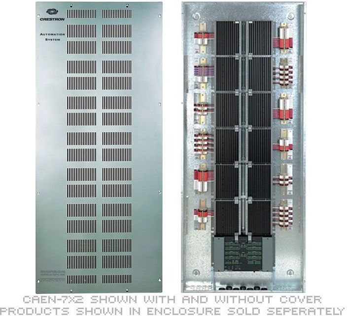 The CAEN Series automation enclosures are designed to house the Crestron® CLX Series lighting control modules, CLX-DIN-AP3 3-Series Control System®, or PAC2M control system. CAEN enclosures are available in an assortment of sizes, and are suitable for surface or flush wall-mount installation. Each model has been engineered to provide a clean and manageable installation and has abundant provisions for wire termination and electrical knockouts.CAEN automation enclosures are designed to use space efficiently, supporting over a hundred possible circuits in the largest model. Both centralized and distributed configurations are possible. A single PAC2M control system installed in a central enclosure can support numerous satellite extension enclosures distributed throughout a residence or commercial facility. Interconnection of the complete network of enclosures requires just one circulating Cresnet® cable. Dozens of keypads, touch screens, wall box dimmers, shade controllers, and other peripherals can also be terminated within an enclosure, with separate compartments provided for high- and low-voltage wiring.Crestron lighting and automation systems are completely convection cooled for silent and reliable operation. A vented front cover is included with every enclosure. All models are constructed of 16-gauge galvanized steel and are pre-drilled for mounting CLX-DIN-AP3 control systems, PAC2M control systems, CLX Series modules, CLT Series terminal blocks, power supplies, and CAEN-BLOCK terminal blocks. Additional non-CLX Series lighting modules and third-party contactors may be installed using Crestron's CAEN-UMP universal mounting plates. Grounding blocks and low-voltage partitions are included.CAEN enclosures are also well suited for all types of Class 2 and Class 3 applications including voice and data structured wiring, security, and RF signal distribution (as permitted by applicable codes).CAEN enclosures are UL and C-UL listed. If you require a complete UL Listed panel, Crestron offers this service through its UL Listed panel shop, providing complete in-factory system configuration and assembly.