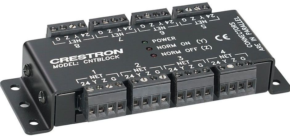 The CNTBLOCK is a parallel distribution block designed to facilitate the termination of multiple Cresnet® cables in an equipment cabinet, closet, or beneath a table. Eight 4-pin connectors are provided, grouped in two sets of four. Power can be isolated between the two sets by removing an internal jumper. Diagnostic LEDs indicate the presence of network power and data. The CNTBLOCK includes integral mounting flanges to allow for attachment to any suitable flat surface.
