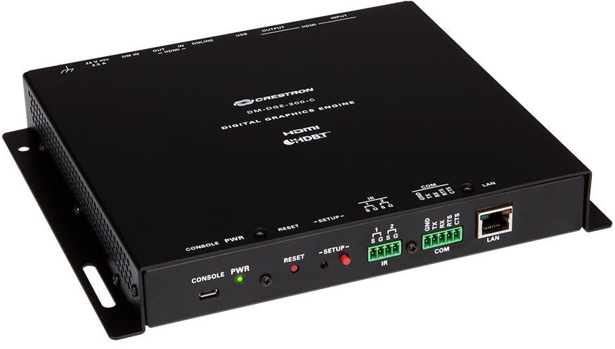 Provides a high-performance graphics engine for the Crestron® TSD-2220 and third-party touch screen displays. Supports advanced Smart Graphics™ with dual-window video from HDMI®, DM®, and streaming sources. Its low-profile, surface-mountable design fits virtually anywhere.Built-in PinPoint™ UX app leverages any room display to create an intelligent meeting space seamlessly integrated with Crestron Fusion® Cloud. Offers an enhanced presentation and productivity solution for meeting rooms and huddle spaces. Provides essential on-screen information and facilitates BYOD presentation without requiring a touch screen, remote, or control system.The DM-DGE-200-C Digital Graphics Engine transforms an HD or Ultra HD touch screen display into an advanced Crestron® controller. Featuring Crestron Smart Graphics™ technology, the DM-DGE-200-C provides for the creation of a completely custom graphical environment combining advanced controls for audio & video, lighting, shades, HVAC, security, and other functions with dual-window video display, annotation, audio feedback, and web browsing. Its low-profile, surface-mountable design allows for a discreet installation behind a flat-panel display, under a table, or inside a lectern or equipment rack.Alternately, the DM-DGE-200-C offers an enhanced presentation and productivity solution for meeting rooms and huddle spaces using Crestron PinPoint™ UX technology. Without requiring a touch screen or any other controls or programming, PinPoint UX leverages the room’s display to create an intelligent meeting space seamlessly integrated as part of a complete Crestron Fusion® Cloud managed enterprise.The DM-DGE-200-C features a 4K UHD capable HDMI® output for connection to the display device, and includes a USB HID port for touch, mouse, and/or keyboard input. Additional control ports are provided to enable control of the display device and other equipment. A single HDMI input allows an AirMedia® wireless presentation gateway or other high-definition video source to be connected and displayed on screen. A DM 8G+® input is included to support 4K UHD and DCI 4K sources connected at a DM® transmitter or switcher.[3] Additionally, H.264 streaming video signals can be received over a high-speed Ethernet connection. Ethernet also provides the interface to a Crestron control system, which is required for touch screen and OSM control applications.