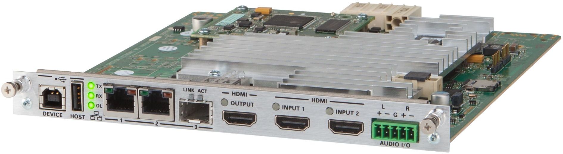 A reliable, high-performance AV over IP encoder or decoder that transports 4K60 4:4:4 video over standard Gigabit Ethernet with no perceptible latency or loss of quality. Installs in a rack-mountable card frame. Supports HDR10 and HDCP 2.2, with built-in scaling and video wall processing, USB and KVM routing, and optional fiber connectivity. Provides a secure, scalable 4K signal routing solution for enterprise and campus-wide content distribution applications.