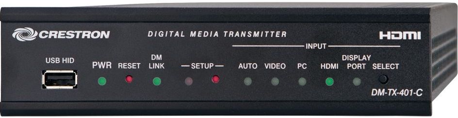 The DM-TX-401-C provides a versatile interface for computers and high-definition AV sources as part of a complete Crestron® DigitalMedia™ system. It functions as a DM 8G+® transmitter and switcher, providing DisplayPort, HDMI®, VGA, composite video, and analog audio inputs. It also functions as a control module, providing RS-232 and IR control ports, plus Ethernet and USB HID ports for a total connectivity solution. In addition to DM 8G+, it is also compatible with HDBaseT®, allowing it to be connected directly to the input of an HDBaseT certified display device. It can be rack-mounted, placed on a shelf, or attached under a table, and connects to the head end or display location using a single CAT type twisted pair cable.Installed in a stationary podium or equipment rack, the DM-TX-401-C offers an ideal solution for integrating rack-mounted sources, switchers, and AV receivers into the DigitalMedia system. Mounted under a table or in a movable lectern or AV cart, it affords a simple means for connecting mobile devices, computers, cameras, and other "BYOD" sources. In a conference center or auditorium, a portable DM-TX-401-C can be connected to the system through wall plates and floor boxes as needed, requiring just a single DM 8G+ jack (MP-WP181-C or MPI-WP181-C) at each location.