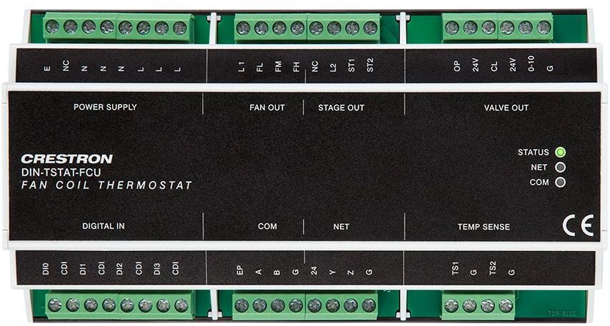 The DIN-TSTAT-FCU is a fan coil unit (FCU) controller designed for use in two-pipe applications. It may be operated as a standalone controller or integrated with a home automation system or building management system (BMS). A Cresnet® port is provided for integration with a Crestron® control system or Crestron Pyng® system. An RS-485 port is also included for communication with Modbus® or BACnet™. Full programmability enables use in various types of applications beyond control of FCUs. Configuration is facilitated using a PC based software application.Standard 35 mm DIN rail mounting allows the DIN-TSTAT-FCU to be installed in a DIN rail enclosure (Crestron DIN-EN series or similar). A 9M wide DIN rail is also included for alternate mounting applications. The unit is 230 Volts AC line powered.