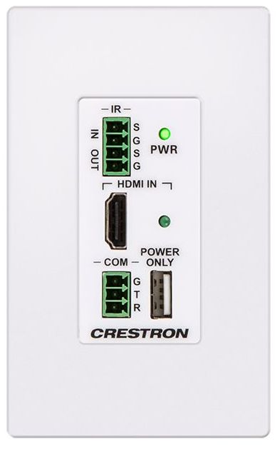 The HD-TXC-101-C-1G-E (-B-T or -W-T) is a wall plate DM Lite transmitter designed to pair with a DM Lite receiver to form a point-to-point signal extender for HDMI®, RS-232, and IR signals. The DM Lite family of products offers a very simple and versatile solution for extending HD, UHD, 2K, and 4K video signals, with stereo or surround sound audio, over a single CAT5e (or better) cable. A cable length of up to 230 ft (70 m) is supported for HD 1080p, WUXGA, and 2K signals, or up to 130 ft (40 m) for UHD and 4K. In addition to video and audio, the HD-TXC-101-C-1G-E supports the extension of RS-232 and IR control signals in either direction.For applications requiring a surface mount version, refer to the HD-TXC-101-C-E.For applications that do not require IR or RS-232 signal extension, refer to the HD-TX-101-C-1G-E-B-T or HD-TX-101-C-1G-E-W-T.A USB power port is included on the HD-TXC-101-C-1G-E to enable use of a Crestron Multihead HD Video Cable (model CBL-MULTI-HD-6, sold separately). The Multihead cable provides expanded input connectivity to support the connection of a laptop computer or mobile device with HDMI, DisplayPort, Mini DisplayPort, or USB Type-C™ video output.Note: The USB power port supplies power only (500 mA maximum) and is suitable for general use to power USB powered devices. No USB data is passed through this connection. It cannot be used to extend USB data, video, or audio signals.The HD-TXC-101-C-1G-E series comes in black or white, and is designed to mount in a single-gang electrical box or plaster ring (not included). It is normally powered by the receiver over the link cable when using a surface mount receiver. If using a wall plate receiver, a single power pack must be purchased (sold separately, model TBA), which may be connected to either the transmitter or receiver.Important: This product is not addressable from a control system and offers no programmable functionality. AV, CEC, IR, and RS-232 signals are simply passed through between a single transmitter and receiver pair. The RJ45 link port on this product is exclusively intended for linking with a single DM Lite receiver. It should not be used to connect to any other equipment or network. DM Lite is not compatible with PoE, PoDM, DigitalMedia 8G+® (DM 8G+®), or HDBaseT®.