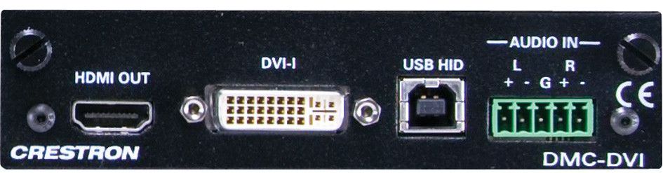 The DMC-DVI is an input card designed for use with any card-based Crestron® DigitalMedia™ Switcher. It provides one DVI-I type input, with a complementary analog stereo audio input and HDMI® pass-through output. A USB HID port is also provided. The DVI-I input allows for the connection of a single-link DVI digital video source or an analog VGA, RGB, or component video source. It handles computer resolutions up to WUXGA 1920x1200, as well as HD video up to 1080p60. Analog video signals are converted to digital using high-quality 30 bit sampling.