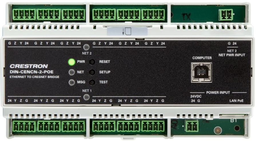 - Many common control system problems are caused by wiring faults, insufficient power, or too many devices. The latter is resolved by increasing bandwidth using Ethernet and limiting the number of devices that can be connected to each subnet. For the other issues, the DIN-CENCN-2-POE provides a full set of diagnostic tools to help identify and resolve them easily. From the unit’s front panel, an installer can press the “TEST” button and observe the LED indicators to see if there are any error codes. This allows wiring problems to be identified before ever powering up the control system. More complete details can be viewed and analyzed using a Web browser or Crestron Toolbox™ software. In a functioning control system, sporadically occurring errors caused by cut or faulty wires, disconnected devices, or failed power supplies can be reported to the control system in real-time to provide error notifications via a touch screen, mobile device, email, text message, SNMP, or Crestron Fusion® enterprise management software. Insertion of an SD memory card (not included) enables logging of Cresnet activity and errors over time, making it easier to diagnose intermittent issues that can’t be duplicated on demand.