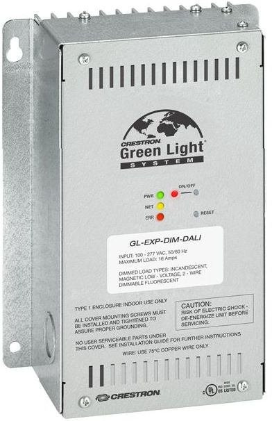 The Crestron Green Light® GL-EXP Series delivers a family of professional lighting control modules for Cresnet® or DALI® based lighting systems. Designed for easy installation on a wall or above a suspended ceiling, these modules offer a perfect solution for adding extra lighting zones to any system without requiring an additional lighting cabinet.The GL-EXP-DIMFDB-DALI is a single-channel dimmer expansion module designed to control 3-wire electronic fluorescent dimming ballasts. Utilizing proprietary zero-cross filter technology, the GL-EXP-DIMFDB-DALI compensates for line voltage and frequency fluctuations, providing superior immunity to power line noise and a dramatic reduction in lamp flicker.