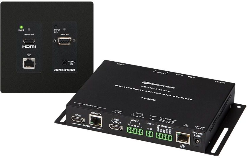 The Crestron® HD-MD-300-C-E delivers an incredibly simple and cost-effective multimedia presentation solution for classrooms and meeting spaces. It allows a laptop or mobile device (HDMI® or VGA) to be connected at a wall plate, and routes the signal to a display or projector up to 230 feet (70 meters) away. An additional HDMI source can be connected at the display device location (or through an optional wall plate near the display). Fully automatic operation detects when a source is connected or disconnected at any input and turns the display on and off, alleviating the need for any control panels or remotes. Built-in scaling ensures an optimal video image for SD and HD video signals, as well as for high-res computer signals.Composed of a compact transmitter and receiver pair (models HD-TX-201-C-2G-E and HD-RX-201-C-E respectively), the HD-MD-300-C-E installs in minutes and requires no special programming. The transmitter mounts in a standard 2-gang electrical box, while the receiver mounts behind the display or above the projector. The only connection required between the transmitter and receiver is a single CAT type twisted pair cable. A LAN port on the receiver allows for connection to an Ethernet network to enable easy setup and configuration via a web browser. Advanced functionality is enabled through integration with a Crestron control system.