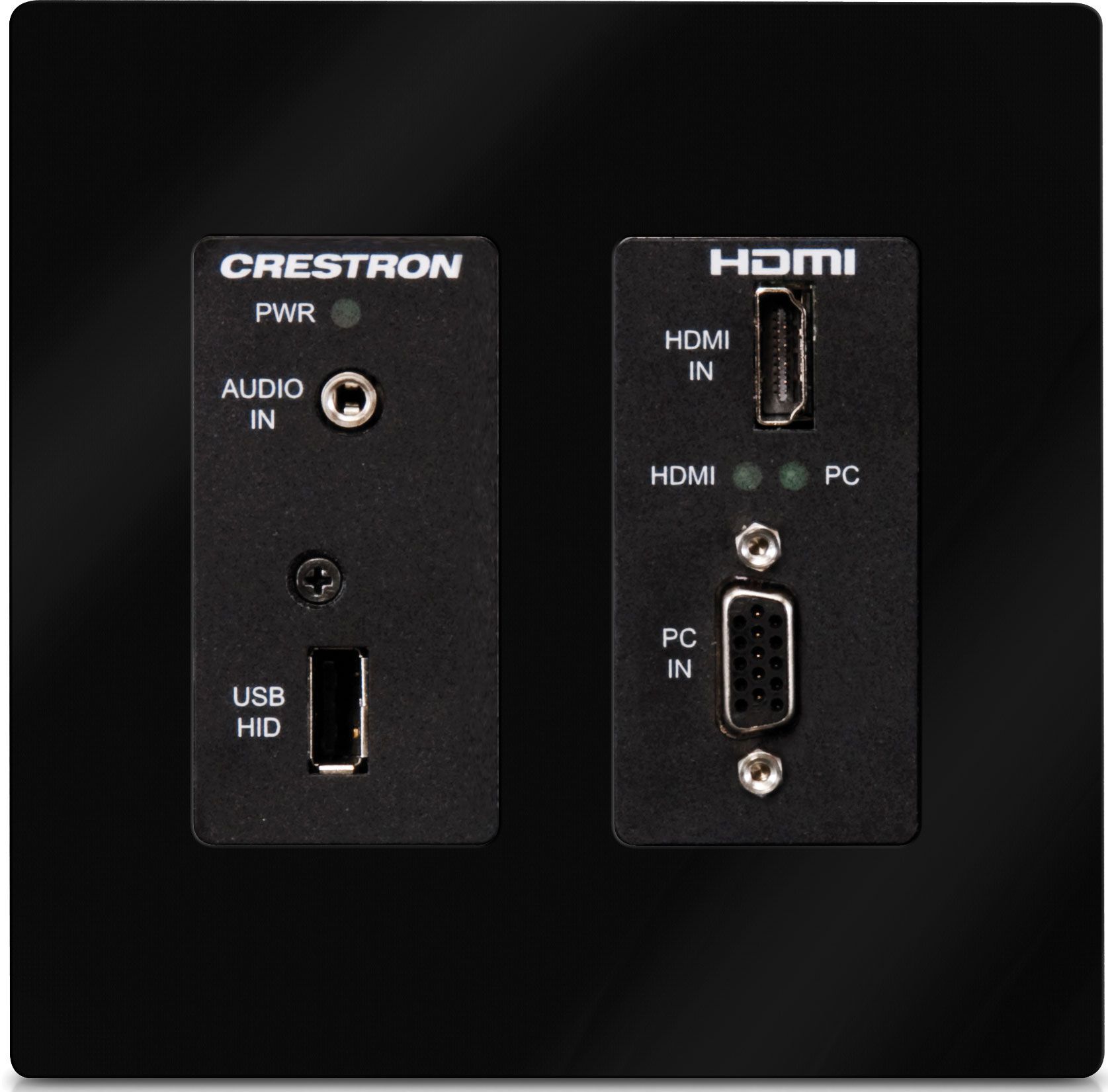 The DM-TX-200-C-2G provides an interface for computers and high-definition AV sources as part of a complete Crestron® DigitalMedia™ system. It is ideal for wall, lectern, and floor box applications in a boardroom, classroom, auditorium, or residence. It functions as a DM 8G+® transmitter and switcher, providing HDMI®, VGA, and analog audio inputs along with a USB HID host port. In addition to DM 8G+, it is also compatible with HDBaseT®, allowing it to be connected directly to the input of an HDBaseT certified display device. It connects to the head end or display location using a single CAT type twisted pair cable. Standard gang-box mounting (2-3/4" deep) allows for installation adjacent to an Ethernet jack (Crestron MP-WP183 or equivalent) for a total connectivity solution.